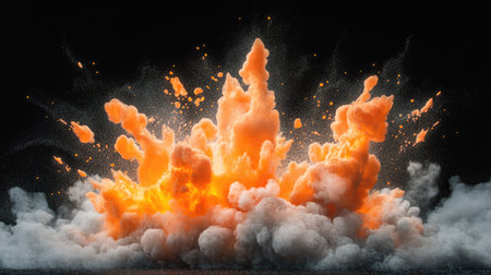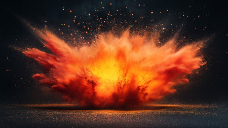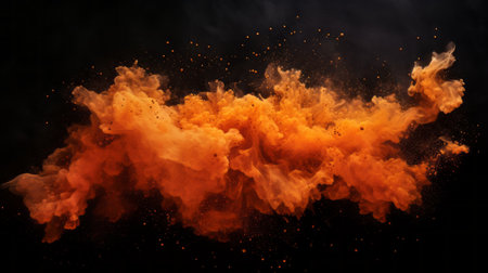 orange dust explosion in the air on a black background, featuring vibrant color scheme and rendered in cinema4d. this ethereal atmospheric installation showcases vibrant and lively hues, capturing the essence of the moment. the raw materials used in this artwork create mesmerizing cloudscapes. ai generated