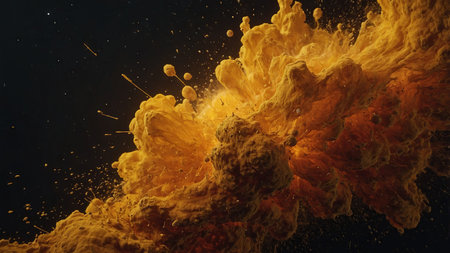 This dynamic image showcases an explosion of vibrant yellow and orange powder, creating an energetic background effect ideal for artistic endeavors and creative projects.
