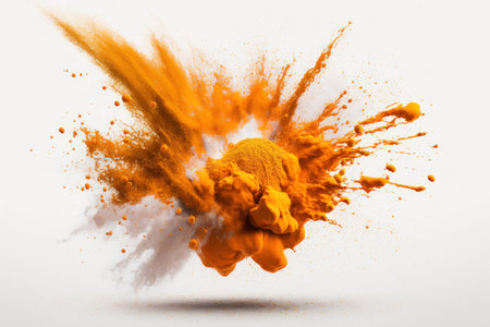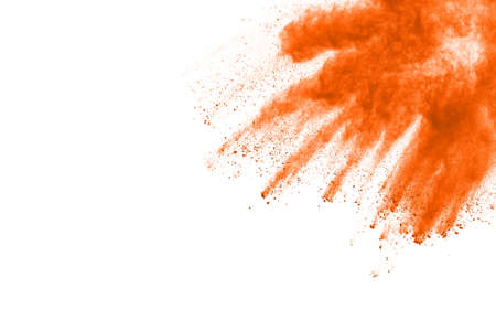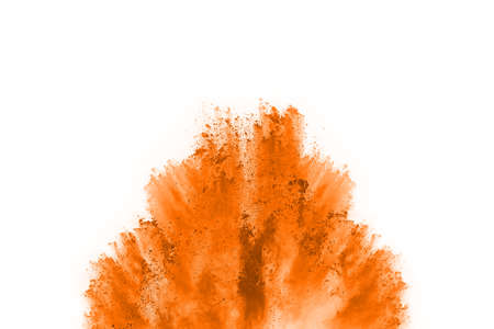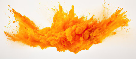 Orange powder explosion against white background, vibrant burst of color and motion. Creative art and dynamic energy concept