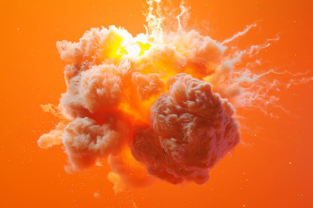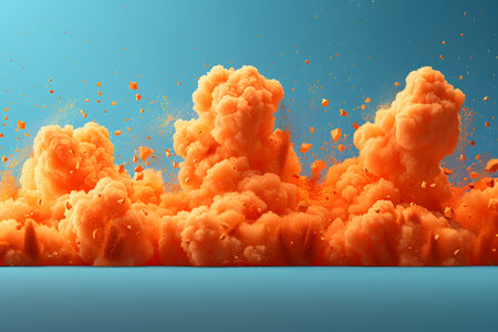 Dynamic scene featuring a vibrant orange explosion cloud against a smooth teal background. this energetic and visually striking image is ideal for use in digital art, advertising, posters, and various design projects, offering a bold and captivating look.