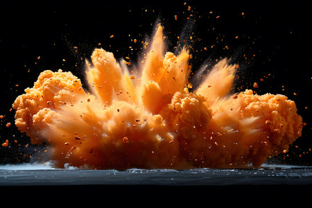 A stunning image showcasing a vibrant orange powder explosion against a striking black background, creating a dynamic and eye-catching visual effect.