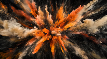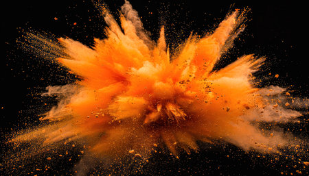 An impulsive and dynamic explosion of orange powder against a black background, captivating the viewer with its brightness and energy