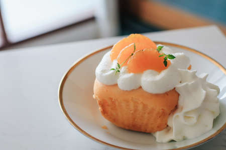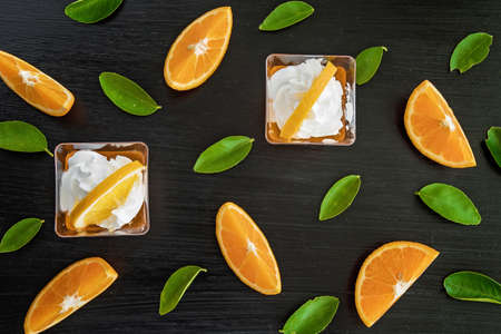 Fresh orange mousse confectionery, with cream and a chocolate decoration