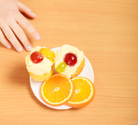 Human hand taking delicious cake with sweet cream and fruits on top. Appetite and gluttony concept.