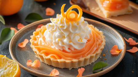A visually stunning orange cream tart topped with fluffy whipped cream and vibrant citrus garnish, perfect for food lovers and dessert enthusiasts.