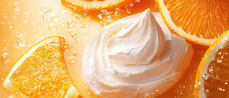 Cosmetic cream displayed with fresh orange segments on a vibrant citrus background