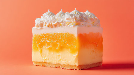 Delight in this visually striking layered dessert featuring a vibrant orange filling, smooth cream, and fluffy whipped topping. Perfect for any occasion.