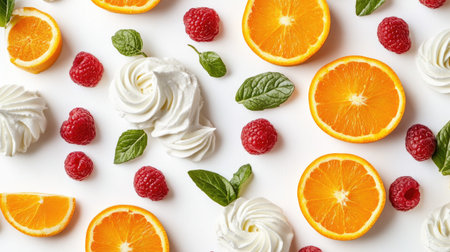 This image features fresh orange slices, juicy raspberries, vibrant mint leaves, and dollops of cream arranged beautifully on a white background. Perfect for food-related designs!