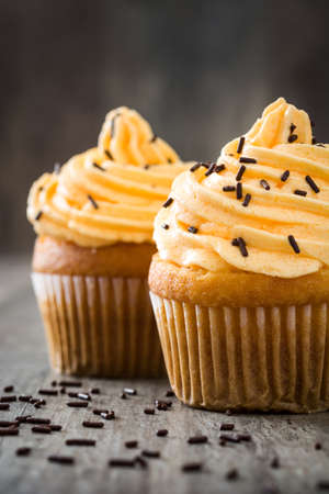 Cupcakes with orange buttercream frosting on top, selective focus