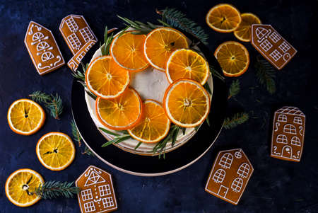 Beautiful delicious cake with sprigs of rosemary and orange frips. New Years dessert. Biscuit cakes, curd cream, gingerbread.