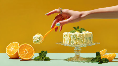 Female hand with blue manicure decorates a cake with orange and mint on a yellow background