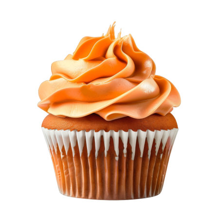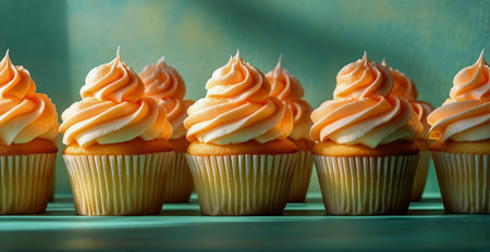 Frosted cupcakes in shades of orange and white sit neatly in a row, showing their delicate swirls of icing. Perfectly baked and ready to be enjoyed, these desserts captivate the eye.