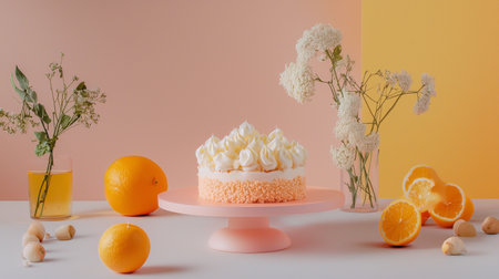 A citrus-inspired dessert featuring a frosted cake garnished with fresh oranges, lemons, and delicate flowers.
