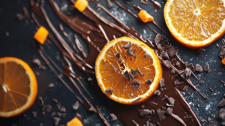 Slices of orange placed on a rustic surface, surrounded by chocolate shaves and warm ambient lighting.
