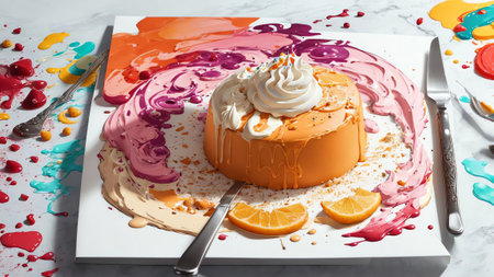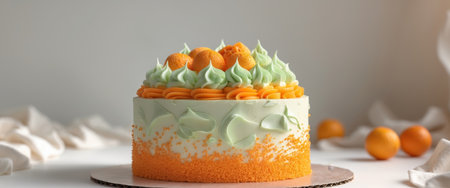 AI Generated. A Stylish Dessert Presentation of a Round Cake with Orange Frosting and Light Green Cream on a Neutral Background
