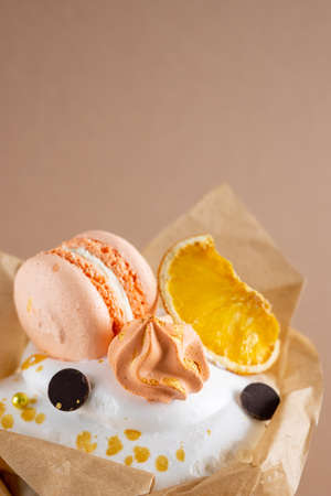 Souffle cake decorated with marmalade fruits and cream closeup