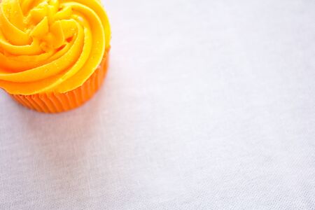 Delicious cupcake with bright cream on orange background, closeup
