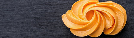 A beautifully arranged spiral of cheddar cheese slices creates an appetizing visual on a dark slate board, perfect for food photography or culinary presentations.