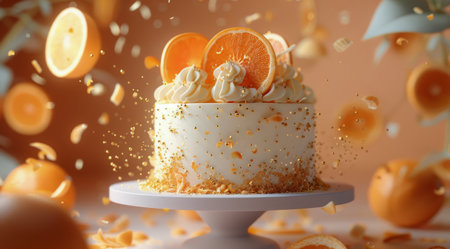 A white cake with orange slices and golden sprinkles sits on a white plate surrounded by orange slices and water splashes.