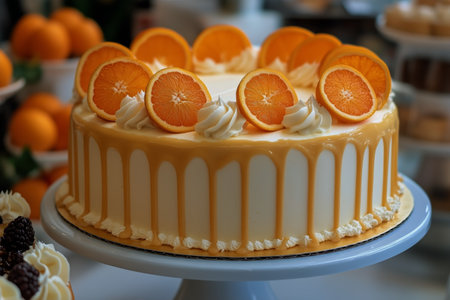A delicious orange cake is beautifully decorated with whipped cream and fresh orange slices, presented on a white cake stand at a bakery.