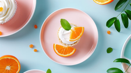 Brighten your day with this delightful cupcake topped with fresh orange slices and mint leaves, set against a cheerful pastel background.