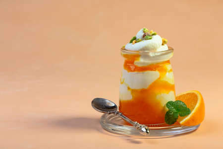 Dessert of low-fat cottage cheese and orange mousse is served in glass jars with pieces of pistachio and fresh mint. Concept of healthy nutrition.