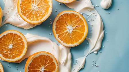 A vibrant arrangement of fresh orange slices nestled on a creamy surface with white sprinkles, creating a visually appealing and mouth-watering composition.