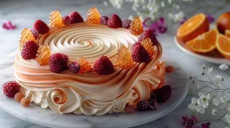 A beautifully decorated cake with raspberries and orange slices.
