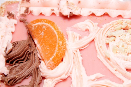 Sand cake with pink icing, nuts, candied fruit and cream