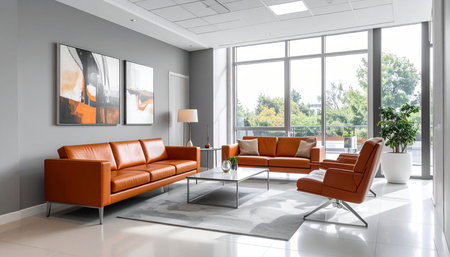 Orange leather sofas and chairs in a modern office lobby with large windows and artwork