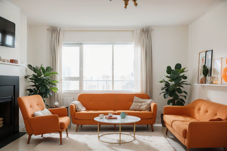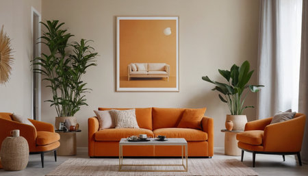 Imagine a stylish and inviting living space with vibrant orange sofas. Perfect for showcasing modern design, comfort, and relaxation in a contemporary home.