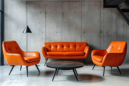 Modern interior design with a gray concrete wall, an orange leather sofa and armchair, and a coffee table. Realistic photography in a studio. --ar 3:2 --v 6.1 Job ID: 7471ab70-0313-4205-991d-682f7d99b4a2