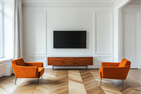 Minimalist living room with a parquet floor, white walls, and two orange armchairs. A large flat-screen television is mounted on the wall above an elegant cabinet. The scene exudes tranquility through its simplicity of design. --ar 3:2 --v 6.1 Job ID: 58fdc2f1-3d57-473d-bcfa-f832896deacb