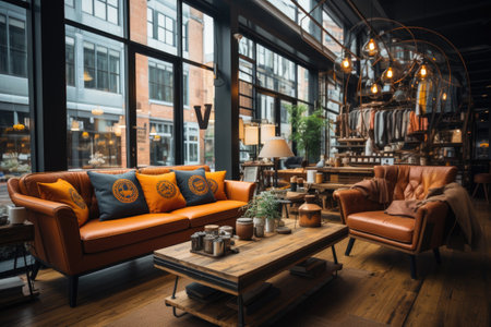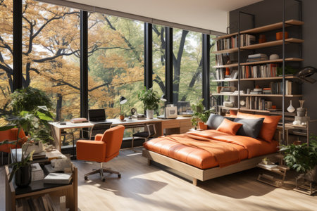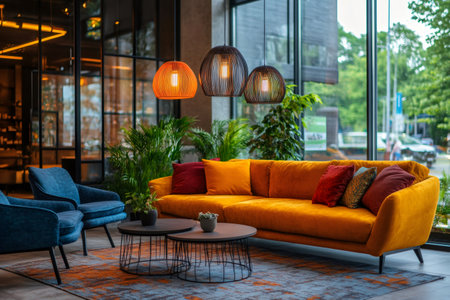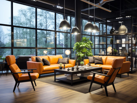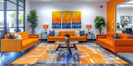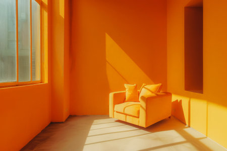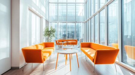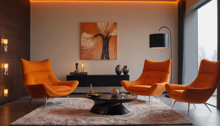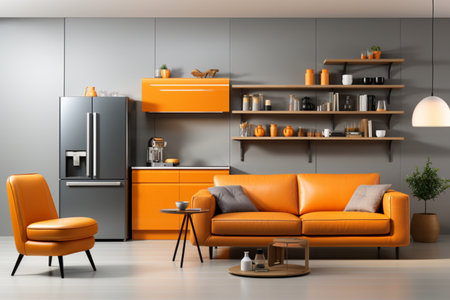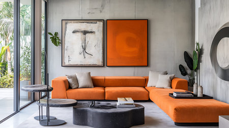 A bright and modern interior featuring vibrant orange furniture in a spacious setting. Ideal for concepts of design, comfort, and contemporary aesthetics.