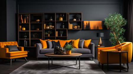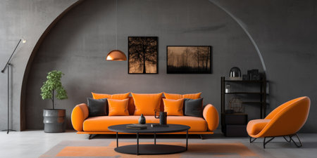 Modern interior of living room with orange sofa, flat with black concrete stucco wall and arch door, home design