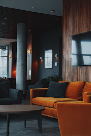 An interior shot features a vibrant orange sofa set against a dark wall. Wooden paneling and a flat-screen television provide visual interest. The scene presents a well-lit space. Suitable for various uses, this image could serve commercial or editorial purposes, displaying modern aesthetics.