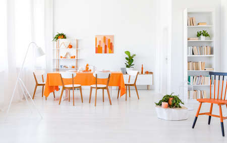 Bright dining room interior with window with drapes, rack with books, fresh plants and table with orange tablecloth, four chairs and dinnerware in the real photo