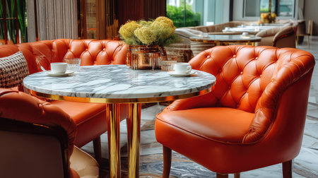 A beautifully designed lounge area features a marble table paired with vibrant orange chairs, creating an inviting and stylish atmosphere, perfect for relaxation.