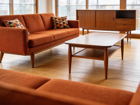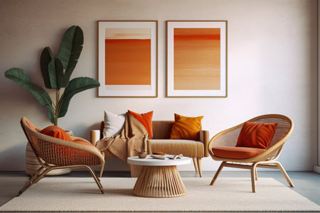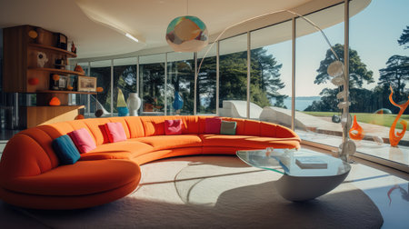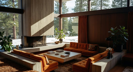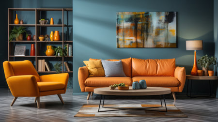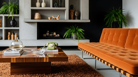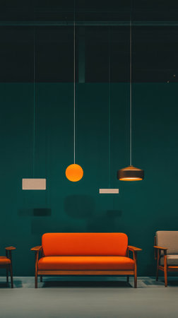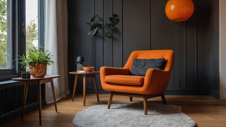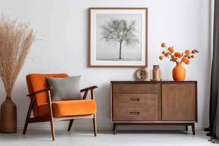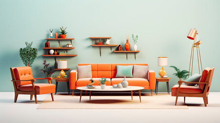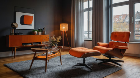 This image beautifully captures the essence of mid-century interior design in a living room, featuring a stylish sofa and vibrant orange chairs. The retro yet timeless ambiance it conveys is perfect for interior design projects, home decor inspiration, or any creative endeavor that seeks to embrace the mid-century modern aesthetic