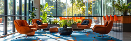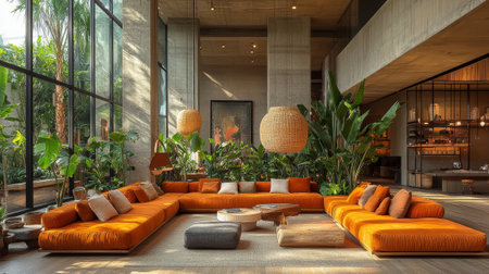 A modern interior space featuring orange furniture, large windows allowing natural light, and indoor plants, creating a vibrant and inviting atmosphere