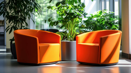 Two bright orange chairs sit elegantly beside lush green plants, creating a vibrant, inviting atmosphere perfect for relaxation and modern decor.