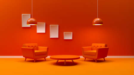 Modern living room interior design with orange armchairs and fireplace. 3d render