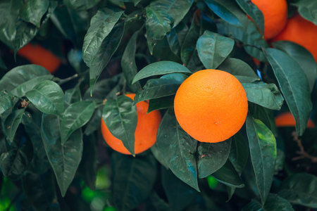close-up of a beautiful orange tree with orange large round oranges with raindrops surrounded by many bright green leaves, soft focus