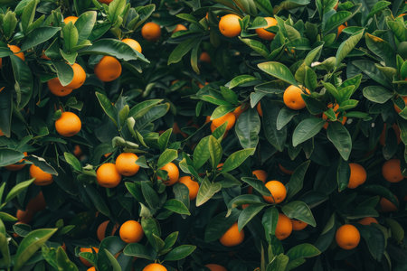 A captivating view of an orange orchard featuring ripe oranges hanging from dark green leaves, creating a lush and vibrant atmosphere.