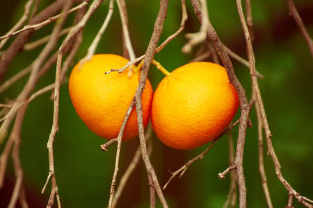 Tangerines on branches. Bright fruit on spring green branches.Cy