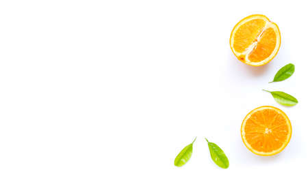 High vitamin C, Juicy and sweet. Fresh orange fruit with green leaves on white background