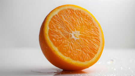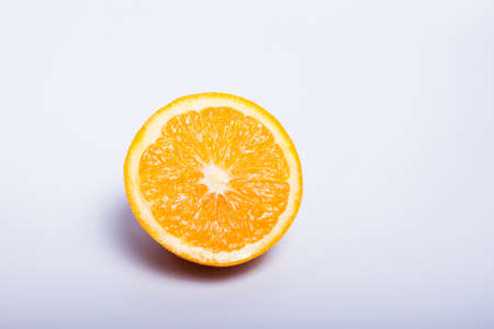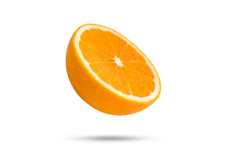 half an orange on a white background with a shadow from the sun.