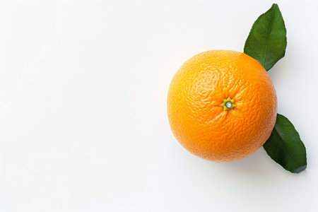 Top view of one orange round fruit on a white background. Rich citrus texture. Copy space.