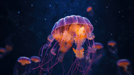A captivating image of a jellyfish gracefully drifting in the deep ocean. The jellyfish displays a mesmerizing combination of orange and purple hues, with long, delicate tentacles. Its bioluminescence casts an ethereal glow against the dark background, highlighting its fragile beauty.