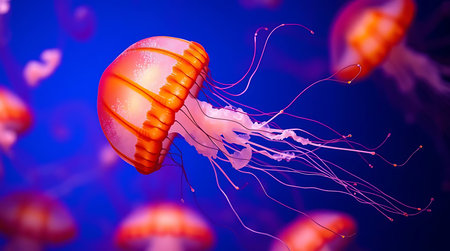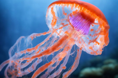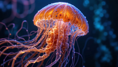 Vibrant aquatic sea jelly with glowing tentacles in blue ocean water
